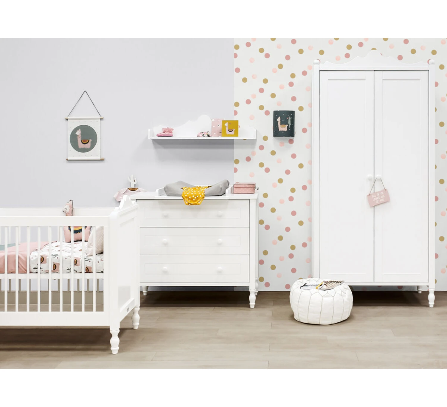 De serie Belle van Bopita bestaat uit romantische meubeltjes voor baby, junior en tiener. De meubeltjes hebben door de mooie koof en de bolling aan de poten een luxe uitstraling. Er is een handige commode passend bij het ledikant. Voor de bijpassende kasten kun je kiezen uit een ladenkast met vijf laden, een 2-deurs kast en een 3-deurs kast.